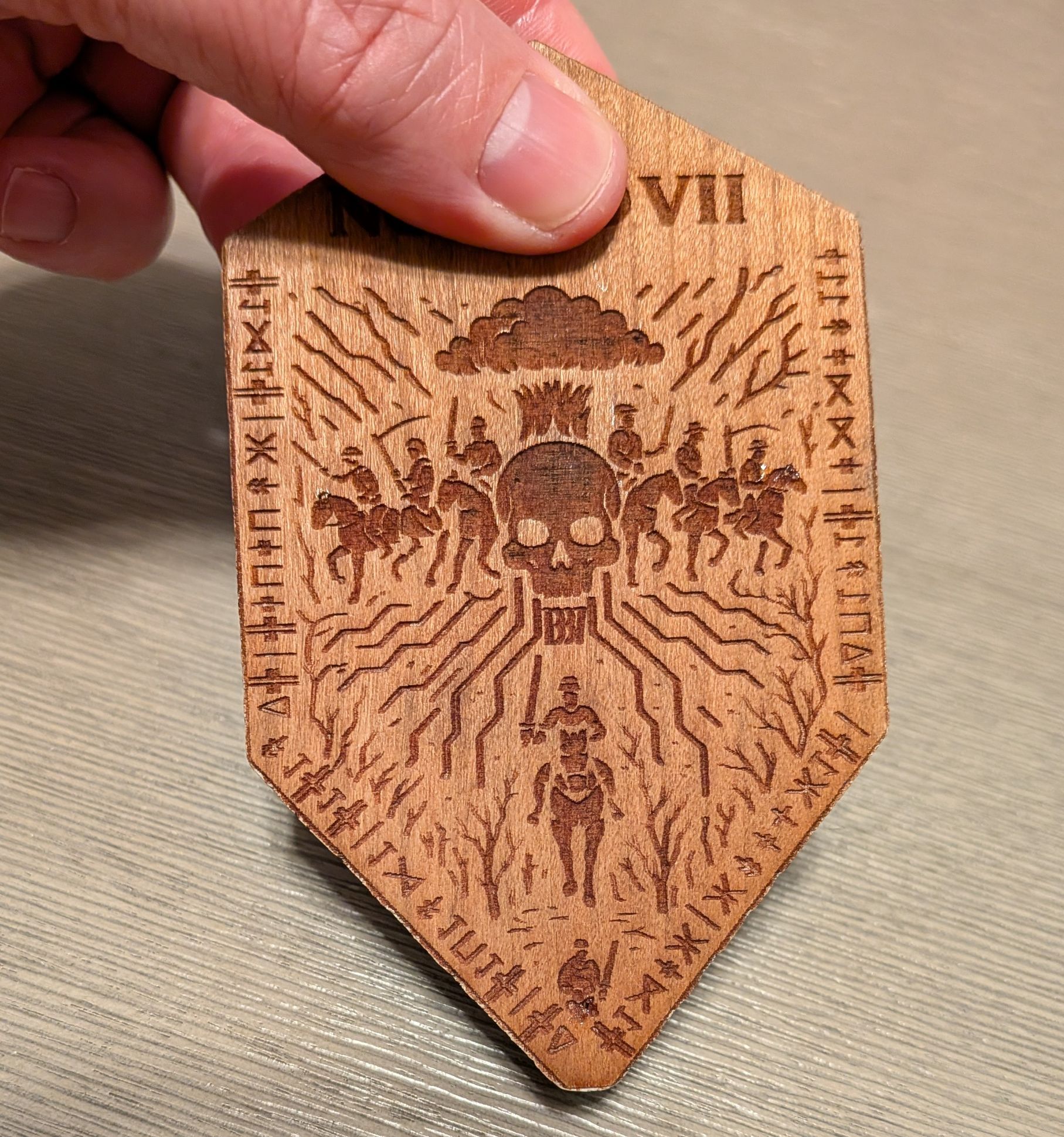My friend - RoRo, the one who got me into this in the first place - had already created a design for the badge which played a bit on the theme of Don Quixote. The design would be laser etched onto a wooden badge (big shout out to Devo for rushing this out!). I thought that was cool, and I knew I could put some cipher text on this that would fit nicely. But how could I give out the other hints?